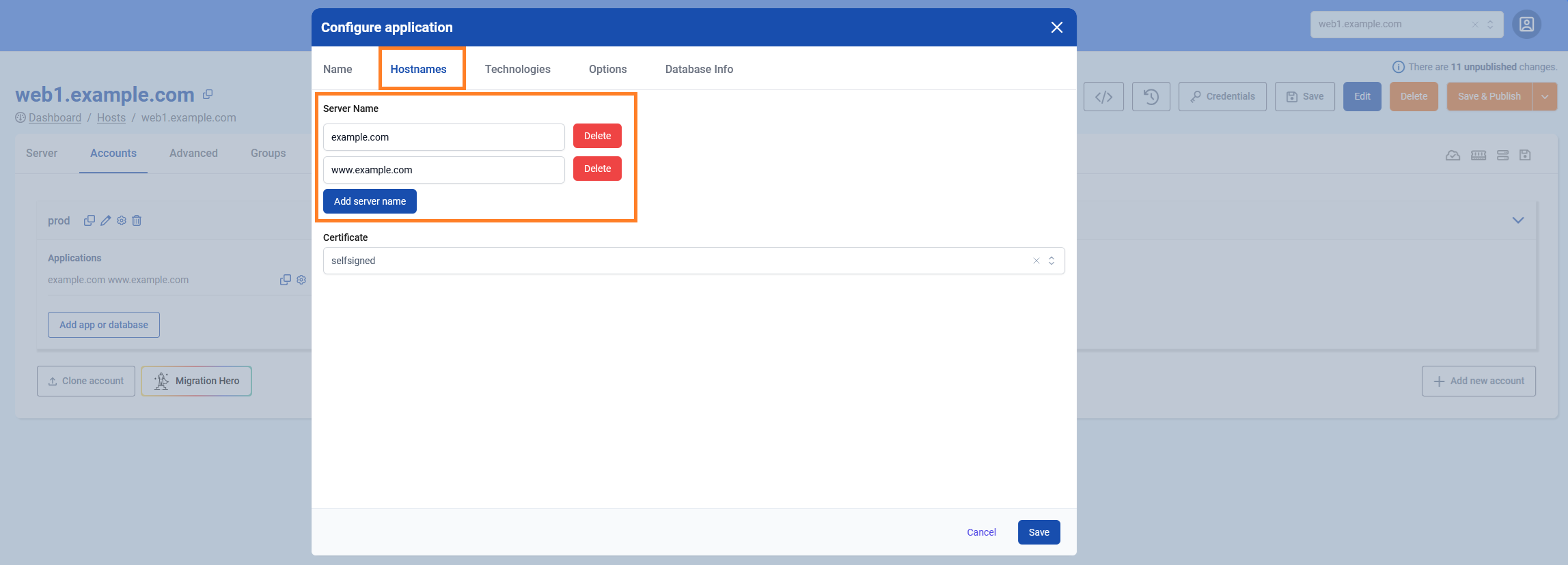 Let's Encrypt certificates can only be validated if the selected hostnames already have the proper DNS settings to point them to the server. If this condition is not met, the validation will fail, and publishing will throw an error! If you cannot adjust DNS, but you do need HTTPS, you can choose a self-signed certificate and change it to Let's Encrypt whenever you're ready.