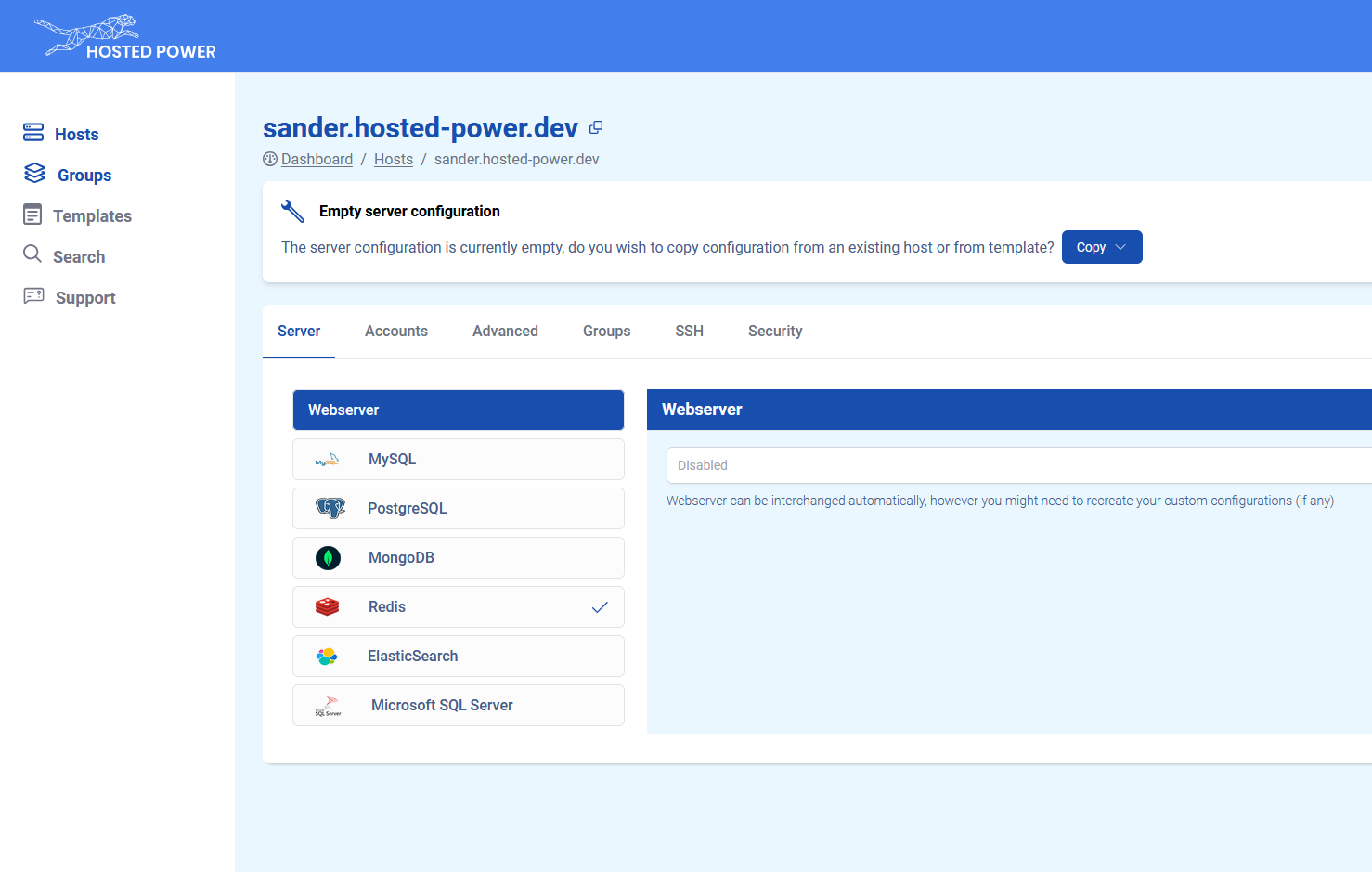 Our platform has several templates available for you to kickstart your server configuration. These can only be used when your server's configuration is still empty, as this would override any existing settings.