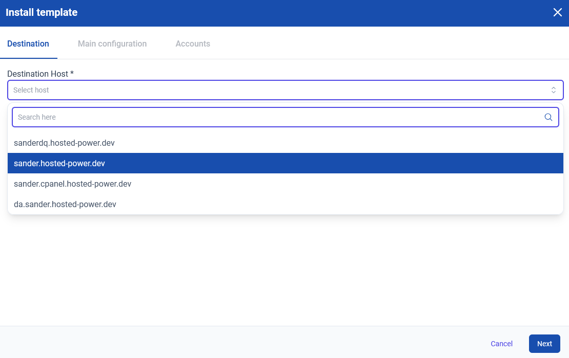 In this config window, you'll be asked to choose which of your servers you'd like to install the template to from a drop-down menu. Then, you'll be asked to add a server name, this is where you add the URL you'd like your application to be reachable at.